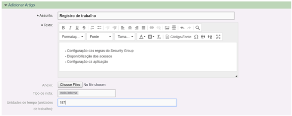 Na imagem abaixo tempo um exemplo de registro de tempo utilizando os recursos nativos do OTRS.