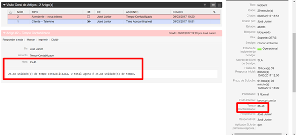 O OTRS tem uma forma de você fazer o registro de tempo que é um campo de texto livre, chamado unidade de tempo.