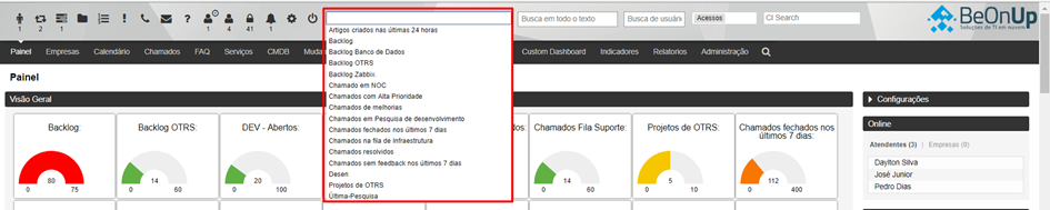 Esse módulo fica disponível através de um menu na interface do usuário no OTRS, lembrando que esse módulo pode ser restringido via permissão, de modo que podemos liberar essa visão apenas a alguns usuários clientes.